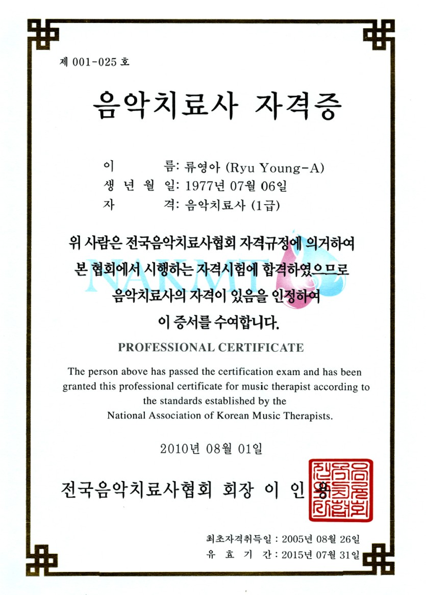 음악치료사 자격증 페이지 정보 작성자 최고관리자 댓글 0건 조회 33회 작성일 25-12-26 11:18 목록 본문 음악치료사 자격증 이전글한국코치협회 KPC 자격증 25.12.26 다음글NLP 스트레스 상담코치 인증서 25.12.26 댓글 0 댓글목록 등록된 댓글이 없습니다.
